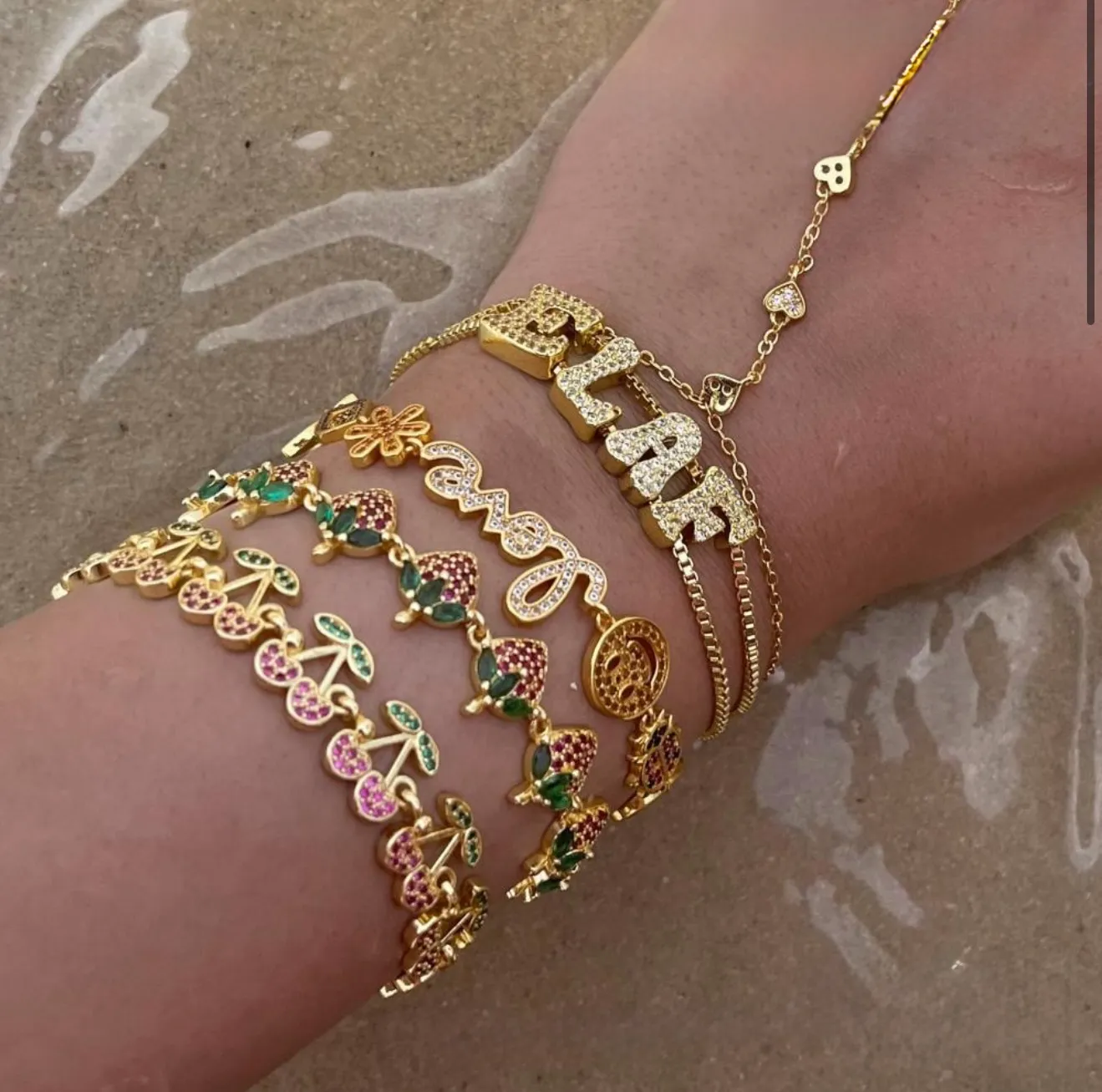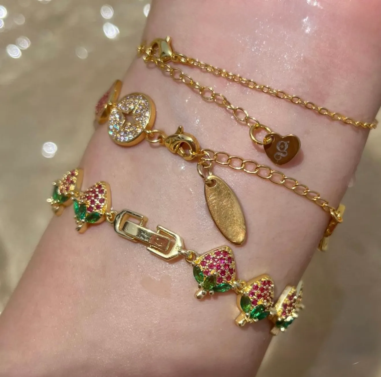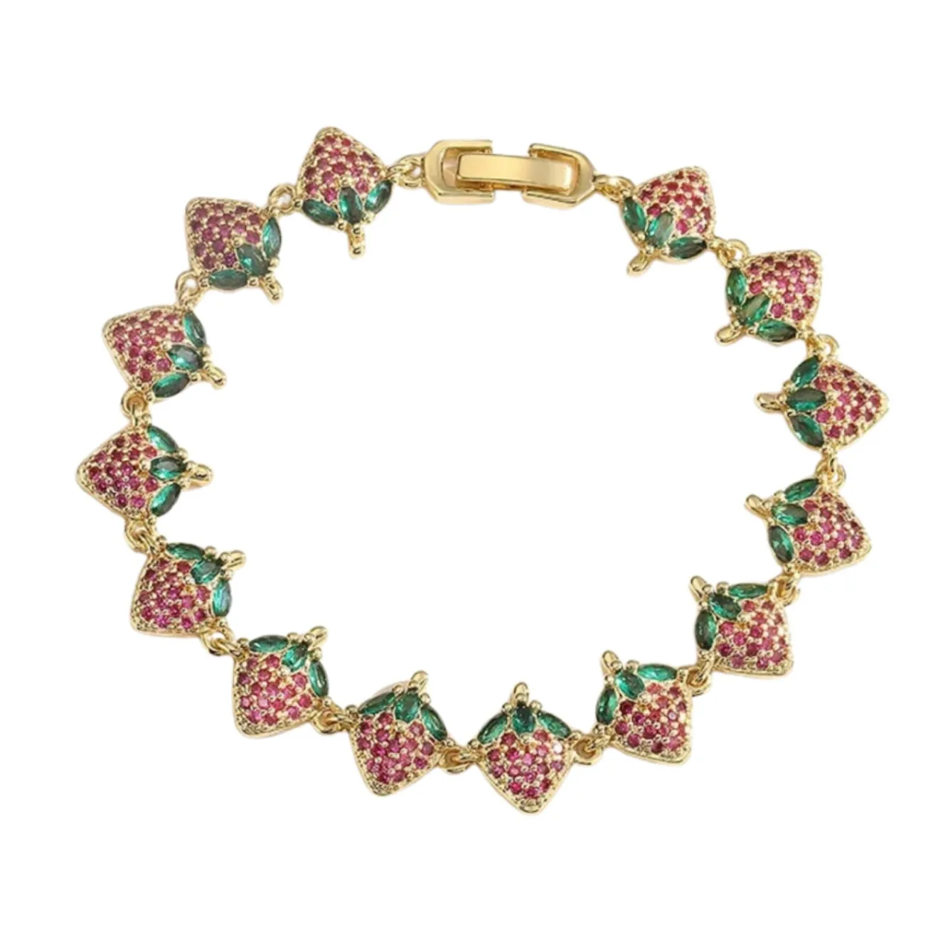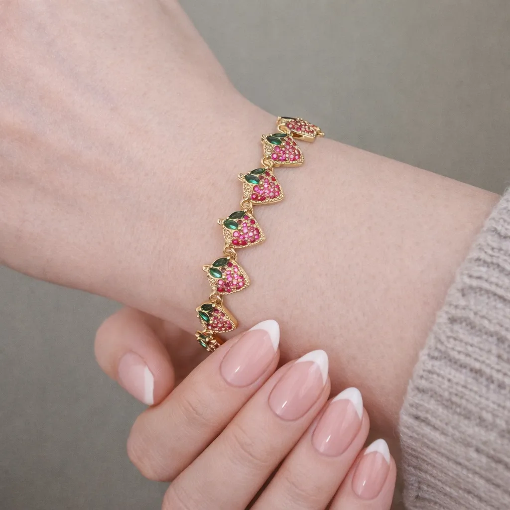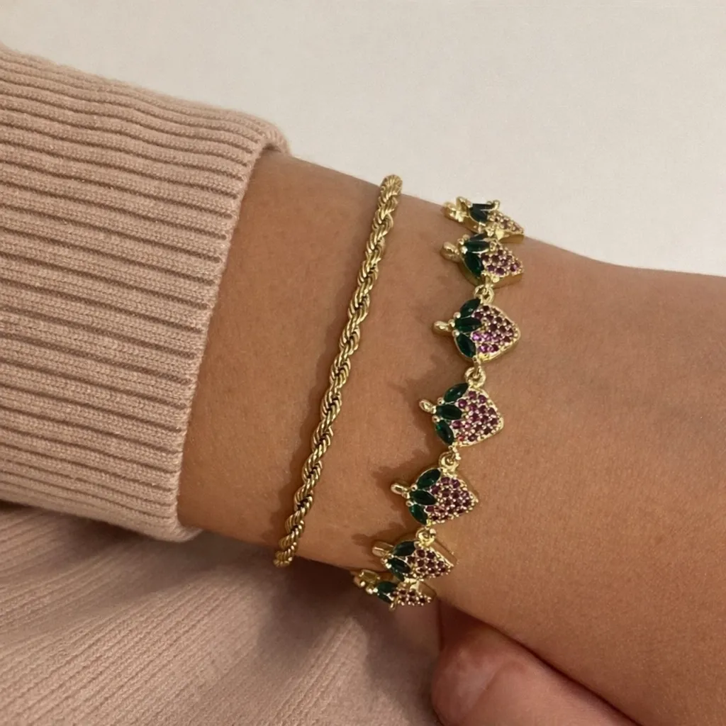 Bracelet Candy Berry en finition dorée, orné de fraises scintillantes serties de fraises roses et de délicates feuilles vert émeraude. Un bijou gourmand et lumineux, parfait pour apporter une touche fun, colorée et estivale à votre look. 🍓✨